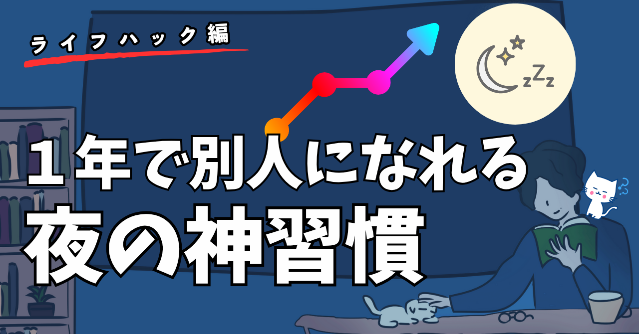 だね。僕は21時ごろにはいつも寝てるからね。そしたら今日は「1年で別人になれる最高の夜習慣」についてレクチャーしよっか?